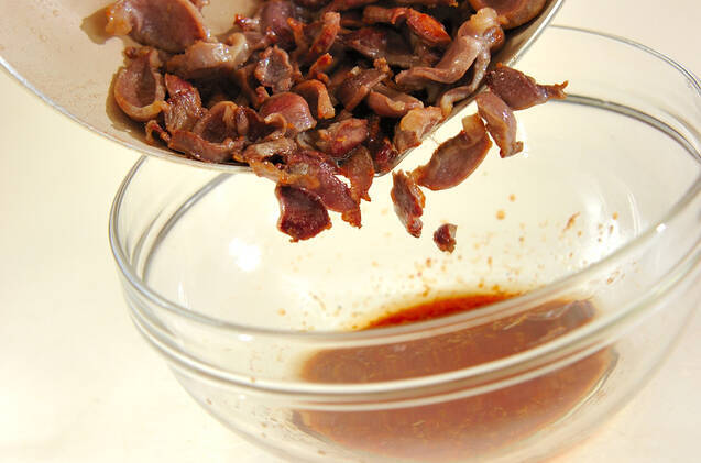 フライパンにサラダ油を強火で熱して砂肝を炒め、熱いうちに<ドレッシング>のボウルに加えて混ぜ合わせる。
