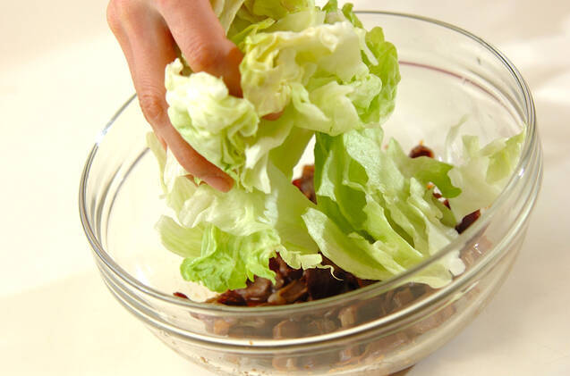 粗熱が取れたらレタス、白髪ネギ、香菜を加え、全体に<ドレッシング>がからまるように混ぜ合わせる。器に盛り、プチトマトを添える。
