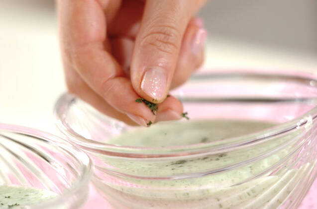 ボウルに移して冷蔵庫で冷やし、器に注ぎ入れ、ドライパセリを散らす。