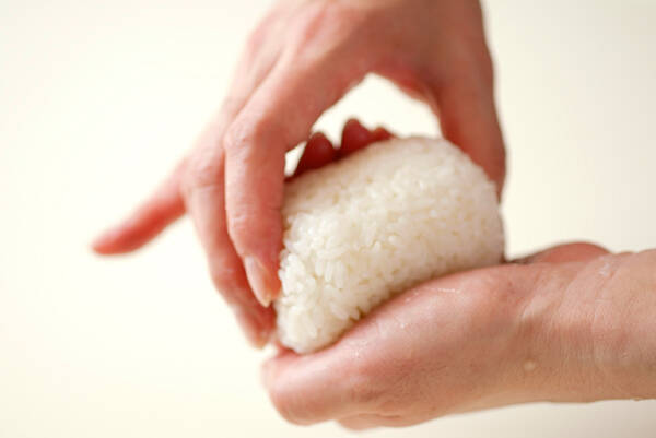 形を整える。三角形・・・1のご飯を左手のひらにのせ(右きき)、指の付け根をVに曲げ、右手は左手と同じ形でご飯にかぶせるように指先を左手の親指に重ねる感じで、のせはじめは軽く両手で押さえる。おにぎりを回転させながら、形を整えつつ握っていく。俵形・・・1のご飯を左手のひらにのせ(右きき)、手のひらをアールに曲げ、右手の指でご飯を覆うように置き、はじめご飯を軽く押さえながらおおまかな俵型にまとめる。俵型のサイドを右手の親指で、反対側のサイドを中指と薬指又は人差し指と中指で押さえながら、左手の中をコロコロまわし形を整える。太鼓形・・・1のご飯を左手のひらにのせ(右きき)、指全体でVに曲げ、右手はアール形でご飯にかぶせるようにのせはじめは軽く両手で押さえる。おにぎりを回転させながら、右手で△の角を作らないように丸く形を整えつつ握っていく。