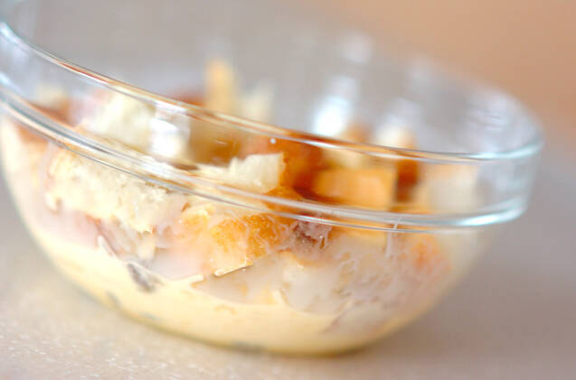 1のフランスパンとレーズンを2のボウルに入れて30分浸す。※30分以上浸すとプリン液がすべてパンにしみこんでしまうので、長時間浸さないで下さい。