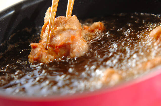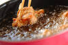 170℃の揚げ油に(1)を入れ、キツネ色になるまで揚げ、油をきる。