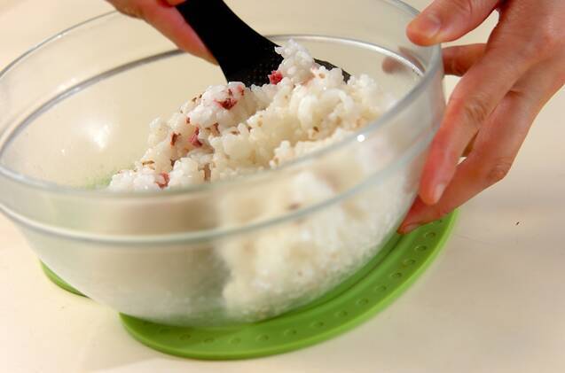 ボウルにご飯を入れ、みじん切りにした桜の花の塩漬けと白ゴマを加えて混ぜる。