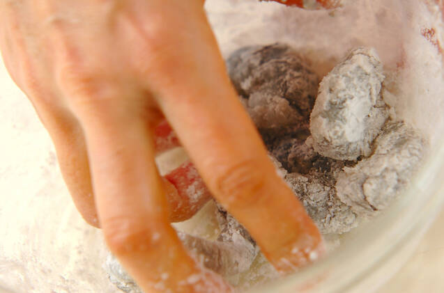 エビは殻と背ワタを取り、塩をもみ込むようにからめ、水気がグレーになってきたら片栗粉を全体にからめ、水洗いして水気を拭き取る(大きい場合は食べやすい大きさに切る)。