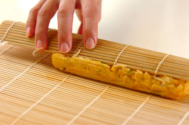 空いた所にサラダ油をひき、向こう側に卵を寄せる。同様に2回くり返し、巻きすに巻いて形を整え、食べやすい大きさに切る。