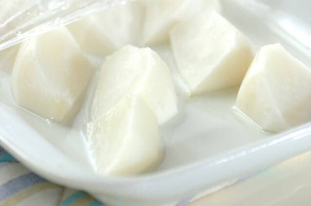 耐熱容器にカブを並べ、白ワイン、塩をかけ、ラップをして電子レンジで4~5分少し透き通るまで加熱し、そのまま2~3分おいておく。電子レンジは600Wを使用しています。