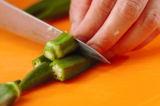 オクラはヘタと先を切り落とし3等分に切る。玉ネギはみじん切りにする。ジャガイモは皮をむいて4等分し、さらに幅1cmに切る。