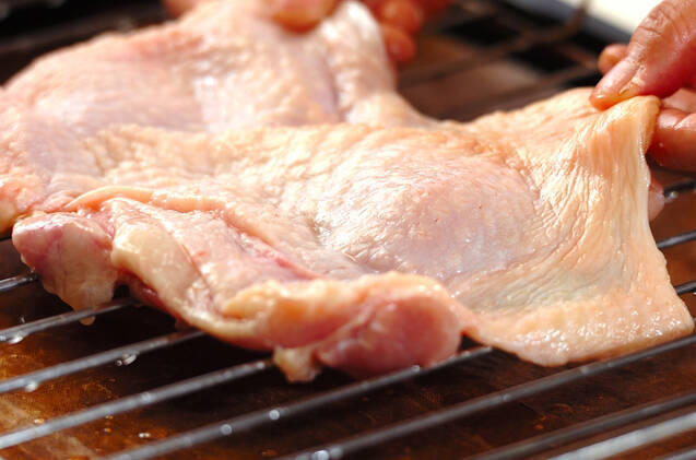 鶏もも肉の両面に塩を振り、薄くサラダ油をぬった焼き網に皮を上にして並べ、200℃に予熱しておいたオーブンで15~20分焼く。