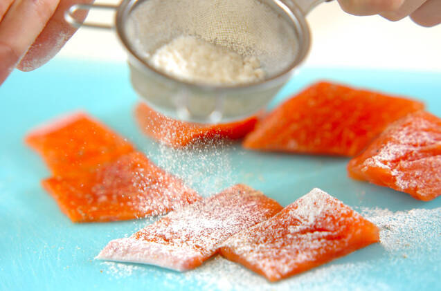 生鮭は皮を削ぎ取って4等分に切り、塩コショウを振り、さらに小麦粉を薄くまぶす。