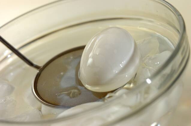 鍋に湯を沸かし、沸騰したら卵を入れ、蓋をして火を止める。10分間置いたらザルにあけ、氷水につけて冷やす。