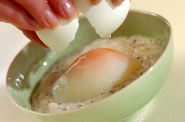 器に(1)を入れて中央にくぼみを作り、温泉卵を割り入れる。麺つゆをかけ、練りワサビを添える。