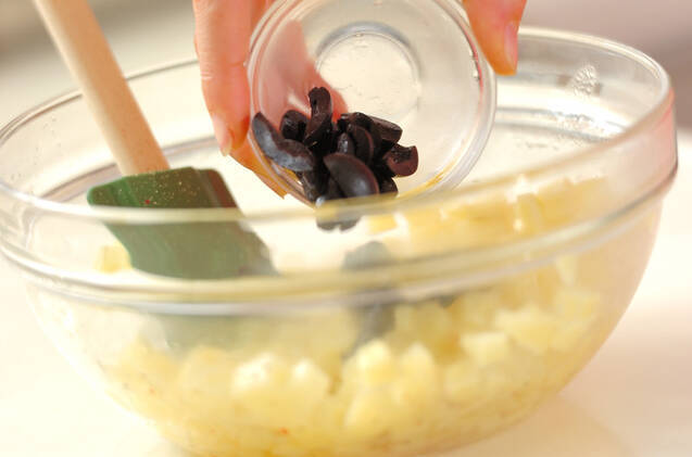 <ドレッシング>のボウルで、水気をきったジャガイモ、ブラックオリーブ、イタリアンパセリを混ぜ合わせ、器に盛る。