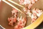 フライパンにサラダ油大1/2を強火で熱し、豚肉を炒め、肉の色が変わればいったん取り出しておく。