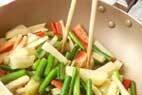 残りのサラダ油大1を加え、強火でニンニクの芽を炒め、鮮やかな緑になれば、水切りしたジャガイモ、水煮タケノコを炒めあわせる。
