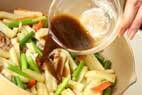 全体に炒められれば、赤ピーマン、2の豚肉を加えて<合わせ調味料>を加え、手早く炒めあわせ、器に盛る。