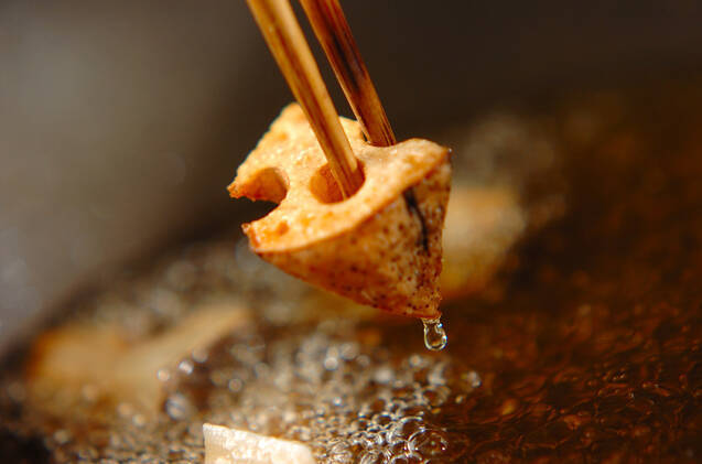 170℃の揚げ油でレンコンをキツネ色になるまで揚げ、サヤインゲンはサッと色よく揚げる。