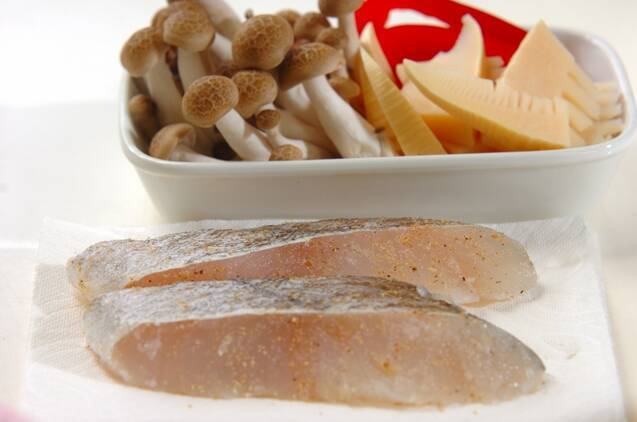 白身魚に分量外の塩コショウを振る。水煮タケノコは食べやすい大きさに切り、さらに幅1cmのくし切りにする。シメジは石づきを切り落とし、小房に分ける。赤パプリカは種とワタを取り、縦4等分に切る。