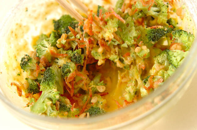 <衣>のボウルにブロッコリー、干し桜エビ、天かすを加え、全体に混ぜ合わせる。