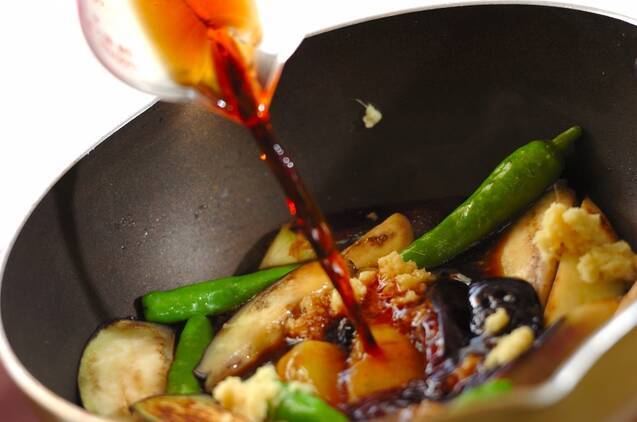 (2)に火が通ったら、<調味料>の材料とおろしショウガを入れ、蓋をして5分程蒸し焼きにする。