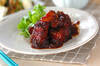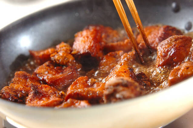 (1)の油をあけて<合わせ調味料>の材料を加えて強火にかけ、軽くトロミがついてきたら(1)の豚肉を戻し入れる。トロミが濃くなって全体にからまったら、器に盛り、香菜を飾る。