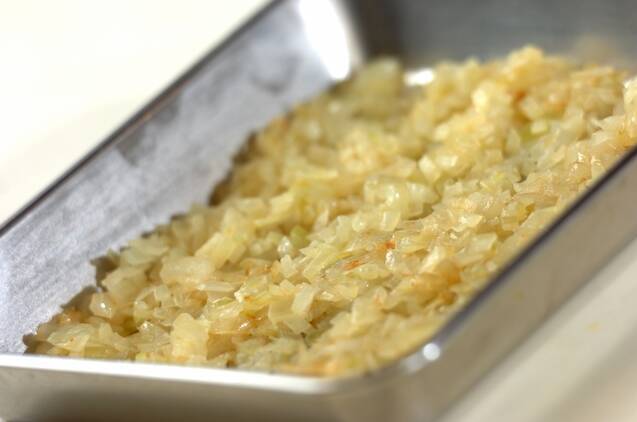 玉ネギはみじん切りにする。フライパンにバターを入れて中火にかけ、溶けだしたら玉ネギと塩を加える。しんなりするまで炒め、バット等に取り出して冷ます。