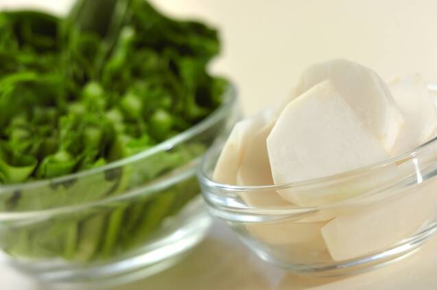 <ソース>のバターと小麦粉を練り合わせておく。<付け合わせ>のカブは皮をむき、幅1cmのくし切りにする。葉は長さ5cmに切る。