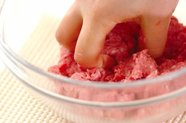 ボウルに合いびき肉と塩を入れ、粘りがでるまでしっかり手で練る。