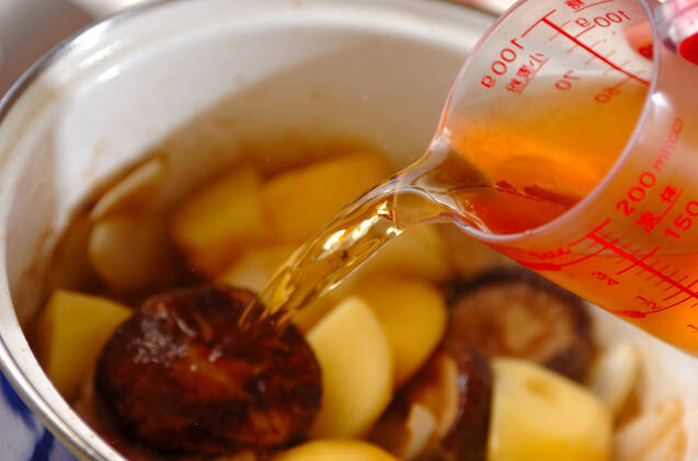 鍋にサラダ油を熱して玉ネギを炒め、しんなりしたら豚肉を加えて炒め合わせる。さらにジャガイモを加えて炒め合わせ、シイタケともどし汁を加え、水をひたひたになるまで注ぎ入れる。煮たったらアクを取り、蓋をしてジャガイモに火が通るまで煮る。