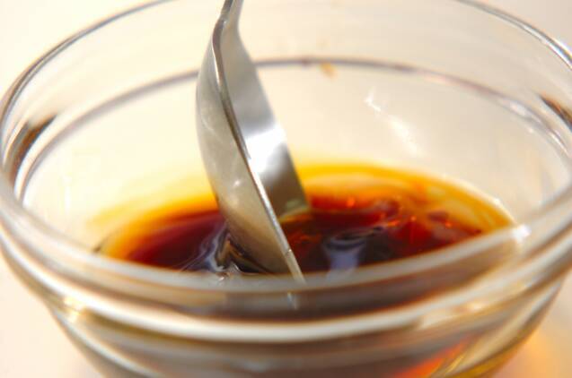 大葉は軸を切り落とし、丸めてせん切りにする。<タレ>の材料を混ぜ合わせる。