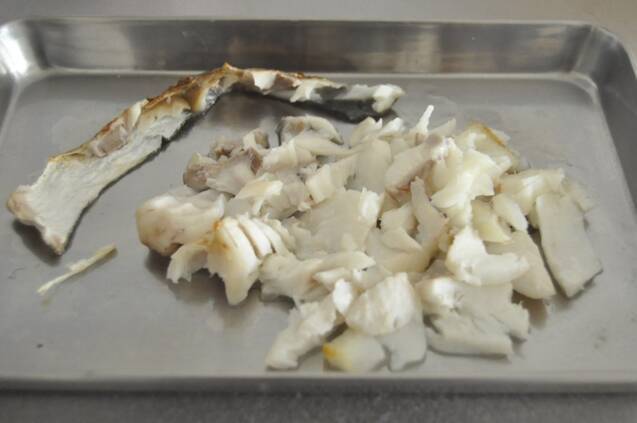 タラはグリルで焼いて取り出し、粗熱が取れたら皮と骨を取り除いて身をほぐす。