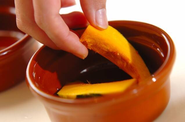 耐熱容器、または天板にオリーブ油をぬり、カボチャを並べ入れて塩コショウをする。