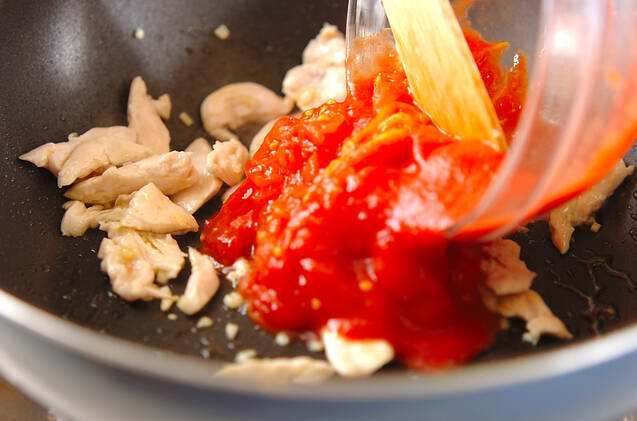 深めのフライパン又は中華鍋にオリーブ油、ニンニクを入れて中火にかけ、香りが立ってきたら鶏ささ身を加え白っぽくなるまで炒め、トマト水煮缶、白ワイン、赤唐辛子を加える。