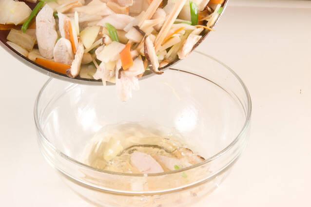 全体に炒められれば、サヤインゲンを加えてさっと炒め合わせ、<調味料>とボウルに混ぜあわせ、少しおき味をなじませ、器に盛る。