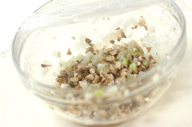 カニは軟骨を取り除く。玉ネギ、マッシュルームはみじん切りにして耐熱容器に入れ、白ワインをかける。ラップをして電子レンジで約1分しんなりするまで加熱し、ザルに上げて汁気をきる。電子レンジは600Wを使用しています。