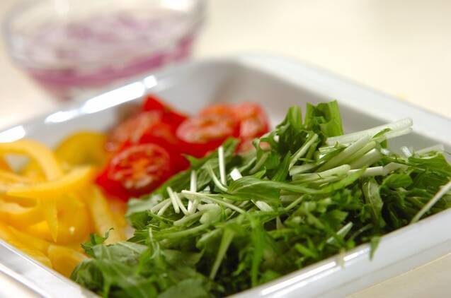 水菜は根元を切り落とし長さ3cmに、プチトマトは半分に切る。紫玉ネギは薄切りにしてサッと水にさらし水気をきる。黃パプリカは薄切りにする。