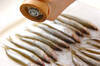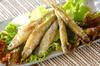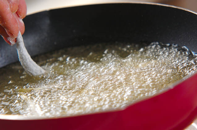 ワカサギに、合わせた<衣>を薄くまぶしつけ、丸ごといただけるように170℃の揚げ油でしっかり揚げ、油を切って塩を振り掛ける。