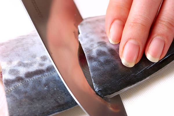 サワラの切り身はサッと水洗いして水気を拭き取り、半分に切る。