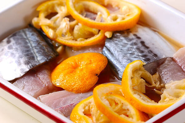 <幽庵ダレ>のユズはきれいに水洗いし、輪切りにし、他の材料とバットに合わせてサワラを漬け、何回かサワラをひっくり返しながら15~20分つける。