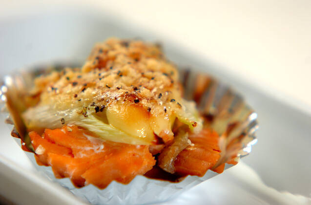 アルミカップに加熱した鮭、白ネギ、マヨネーズ、粉チーズ、粗びき黒コショウの順にのせ、トースターでこんがりと焼く。