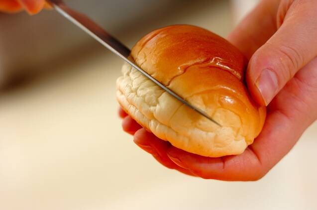 バターロールは縦の長いほうを横から2/3ほど切り込みを入れ、マヨネーズを切り口にぬる。グリーンリーフをひとくち大にちぎりながら挟み、ベーコンは舌に見えるように挟む。