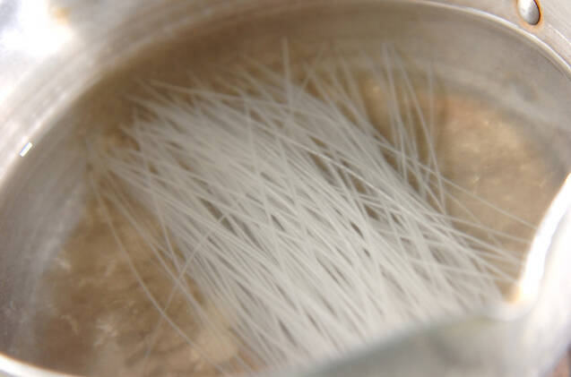 春雨は火を止めた熱湯に入れて10分置き、水に取ってよく洗い、水気を切って食べやすい長さに切る。