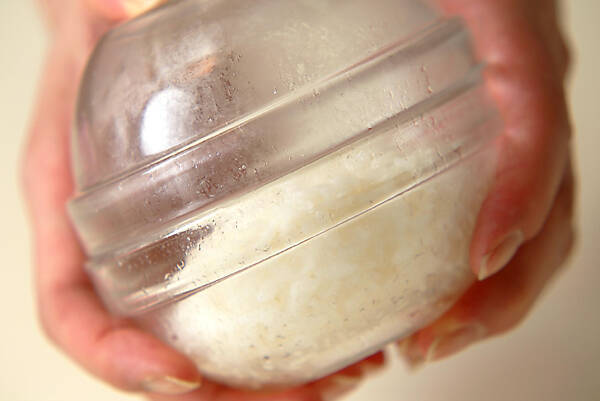 容器、またはラップに握りたい量のご飯を入れ、軽くまとめる。容器の場合はもう1つの容器をかぶせしっかり押さえて上下させれば、容器に中でひとまとまりにまります。ラップの場合はラップでご飯を包んで軽く振れば、ひとまとまりになります。中に具を入れる場合は、この時に入れます。