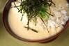 炊きあがった麦ご飯を全体に混ぜ合わせ、お茶わんによそい2のトロロ汁をかける。好みで刻みネギや刻みのり、青のり、おろしユズ皮を散らす。