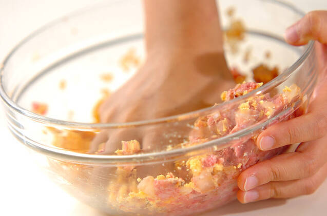 <タネ>の材料に黄身を加え、練るようによく混ぜ合わせる。