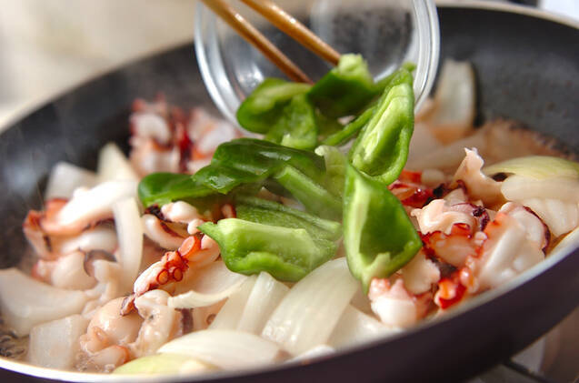 フライパンにオリーブ油、ニンニクを入れて弱火にかけ、香りがたってきたらゆでタコ足、玉ネギを中火で炒める。玉ネギが少し透き通ってきたらピーマンも炒める。
