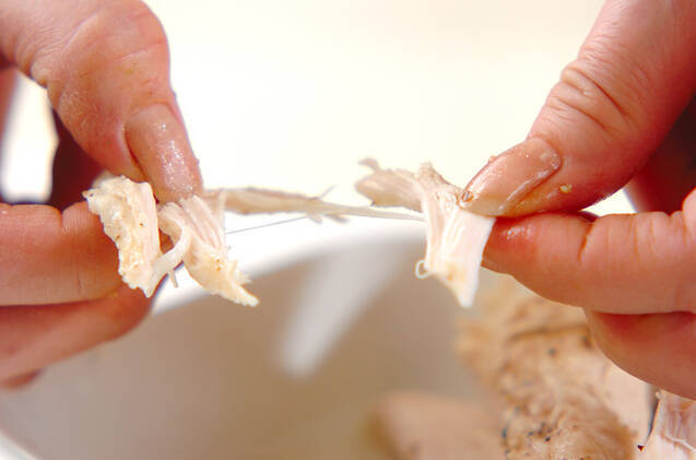 鶏ささ身は筋を引いて耐熱容器に並べ、酒を振る。塩コショウをしてふんわりラップをかけ、電子レンジで2~2分30秒加熱し、そのままおいて余熱で中まで火を通す。粗熱が取れたら細く裂く。電子レンジは600Wを使用しています。
