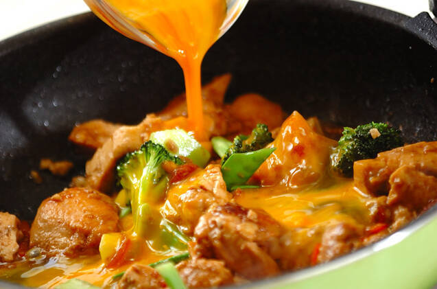 ブロッコリー、キヌサヤを加えてひと混ぜし、溶き卵を加える。卵がお好みのかたさになったら火を止め、器に盛る。