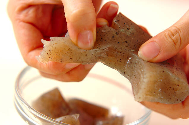 板コンニャクは熱湯に入れて臭みをぬき、粗熱が取れたら手でひとくち大にちぎる。