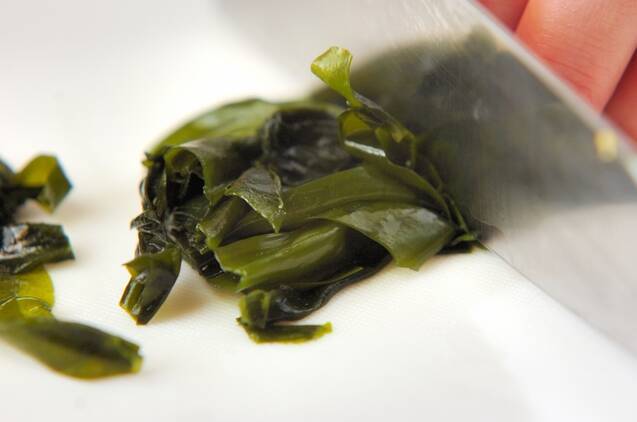 塩ワカメは水洗いして塩を洗い流し、ザク切りにして流水で洗い、水気を絞る。