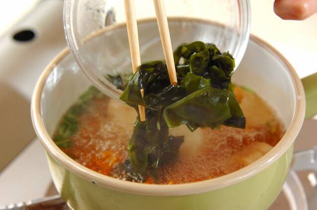 麩を加えてひと煮たちさせ、ワカメ、ミツバを加えて火を止め、器に注ぐ。